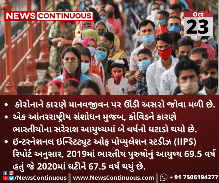 ઇન્ટરનેશનલ ઇન્સ્ટિટ્યૂટ ઓફ પોપ્યુલેશન સ્ટડીઝ (IIPS) રિપોર્ટ અનુસાર, 2019માં ભારતીય પુરુષોનું આયુષ્ય 69.5 વર્ષ હતું જે 2020માં ઘટીને 67.5 વર્ષ થયું છે.
