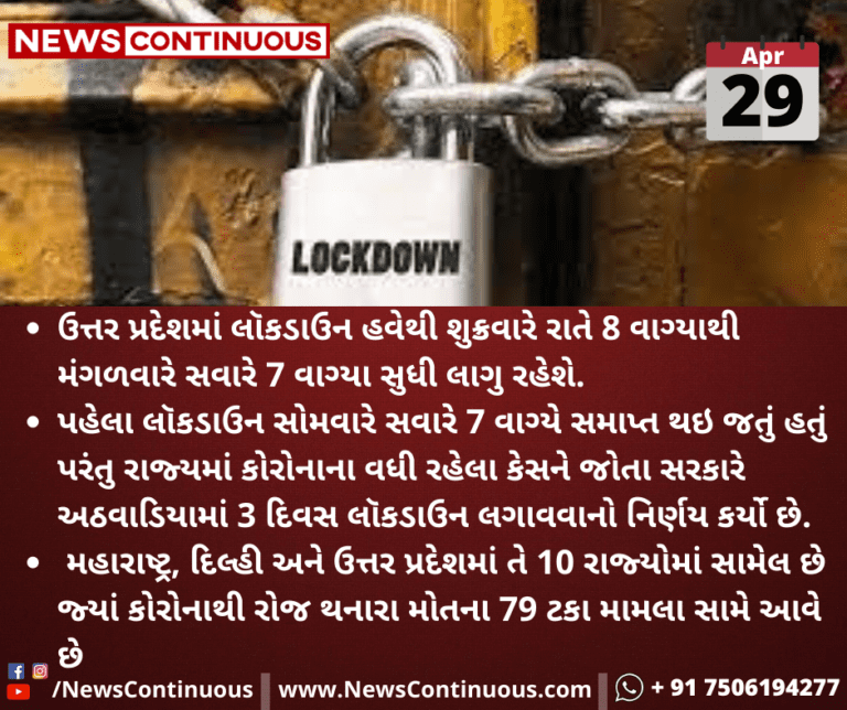 ઉત્તર પ્રદેશમાં લૉકડાઉન હવેથી શુક્રવારે રાતે 8 વાગ્યાથી મંગળવારે સવારે 7 વાગ્યા સુધી લાગુ રહેશે.