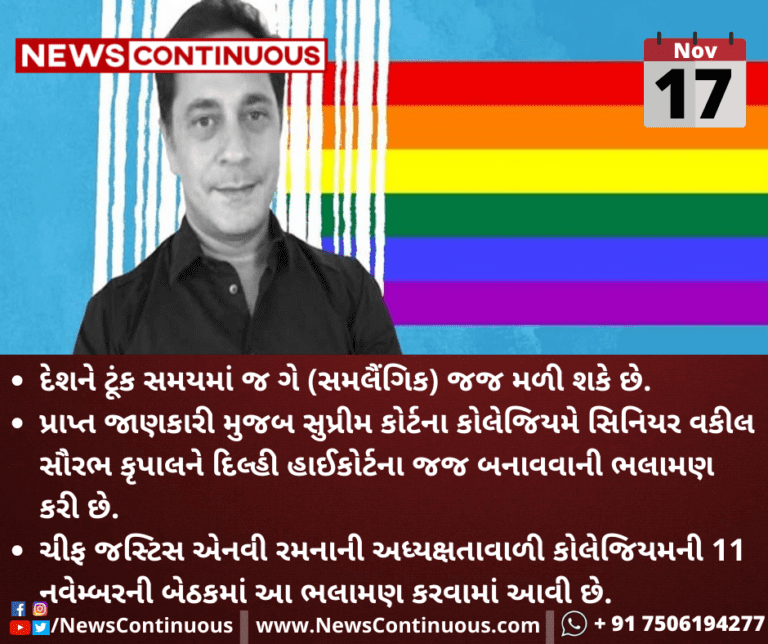 પ્રાપ્ત જાણકારી મુજબ સુપ્રીમ કોર્ટના કોલેજિયમે સિનિયર વકીલ સૌરભ કૃપાલને દિલ્હી હાઈકોર્ટના જજ બનાવવાની ભલામણ કરી છે.