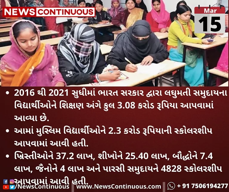 2016 થી 2021 સુધીમાં ભારત સરકાર દ્વારા લઘુમતી સમુદાયના વિદ્યાર્થીઓને શિક્ષણ અંગે કુલ 3.08 કરોડ રૂપિયા આપવામાં આવ્યા છે.