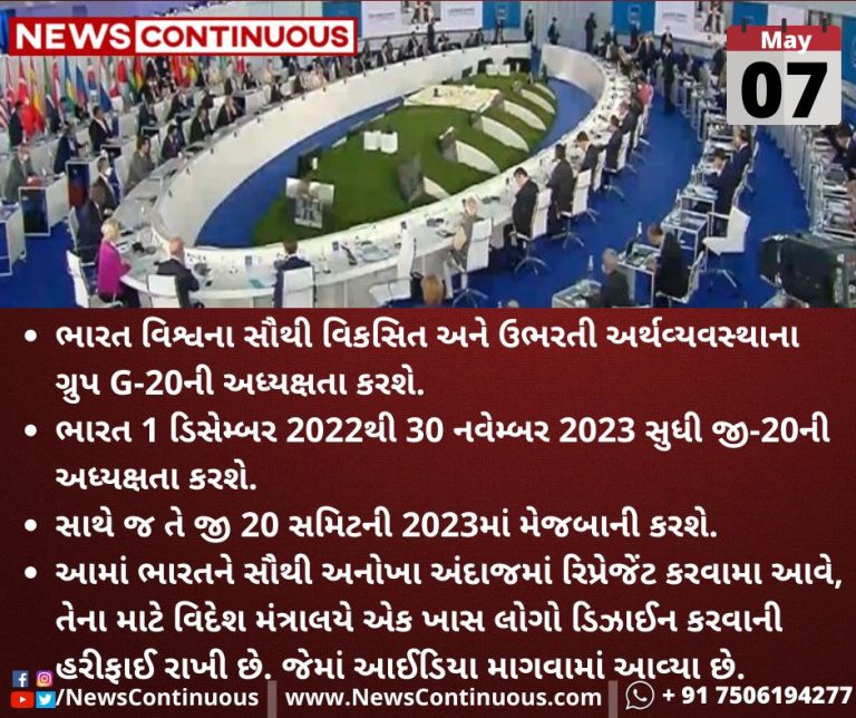 ભારત 1 ડિસેમ્બર 2022થી 30 નવેમ્બર 2023 સુધી જી-20ની અધ્યક્ષતા કરશે.