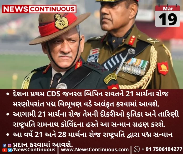 દેશના પ્રથમ CDS જનરલ બિપિન રાવતને 21 માર્ચના રોજ મરણોપરાંત પદ્મ વિભૂષણ વડે અલંકૃત કરવામાં આવશે.