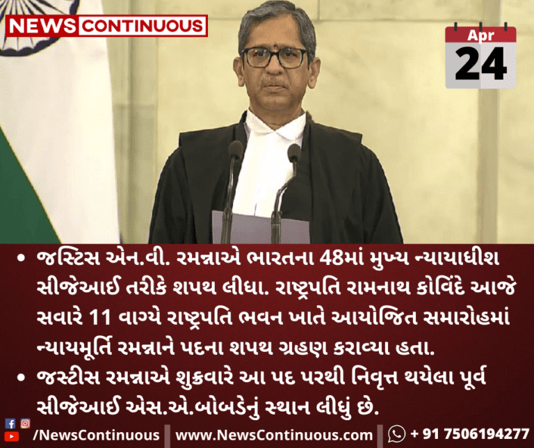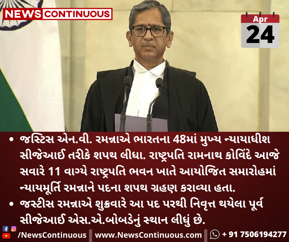 જસ્ટિસ એન.વી. રમન્નાએ ભારતના 48માં મુખ્ય ન્યાયાધીશ સીજેઆઈ તરીકે શપથ લીધા. રાષ્ટ્રપતિ રામનાથ કોવિંદે આજે સવારે 11 વાગ્યે રાષ્ટ્રપતિ ભવન ખાતે આયોજિત સમારોહમાં ન્યાયમૂર્તિ રમન્નાને પદના શપથ ગ્રહણ કરાવ્યા હતા.