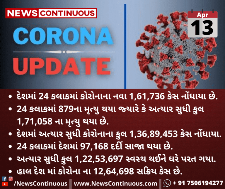 દેશમાં અત્યાર સુધી કોરોનાના કુલ 1,36,89,453 કેસ નોંધાયા.