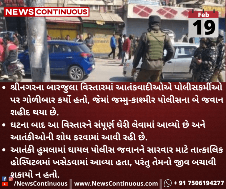 શ્રીનગરના બારજુલા વિસ્તારમાં આતંકવાદીઓએ પોલીસકર્મીઓ પર ગોળીબાર કર્યો હતો, જેમાં જમ્મુ-કાશ્મીર પોલીસના બે જવાન શહીદ થયા છે.