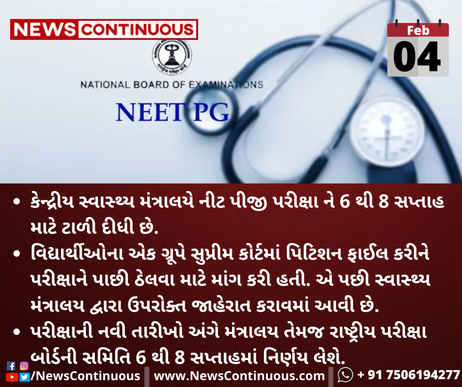 કેન્દ્રીય સ્વાસ્થ્ય મંત્રાલયે નીટ પીજી પરીક્ષા ને 6 થી 8 સપ્તાહ માટે ટાળી દીધી છે.