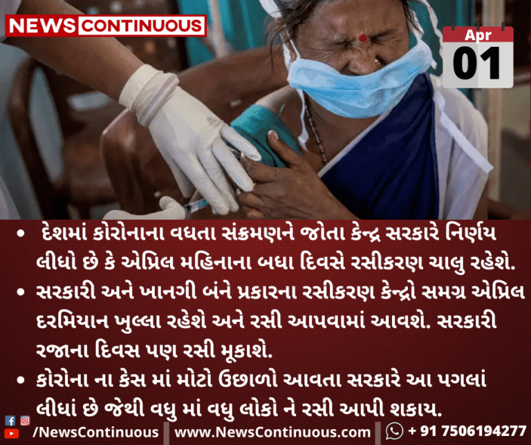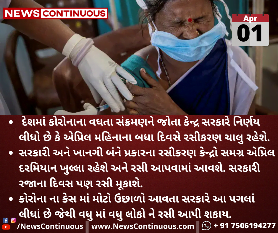 - દેશમાં કોરોનાના વધતા સંક્રમણને જોતા કેન્દ્ર સરકારે નિર્ણય લીધો છે કે એપ્રિલ મહિનાના બધા દિવસે રસીકરણ ચાલુ રહેશે.