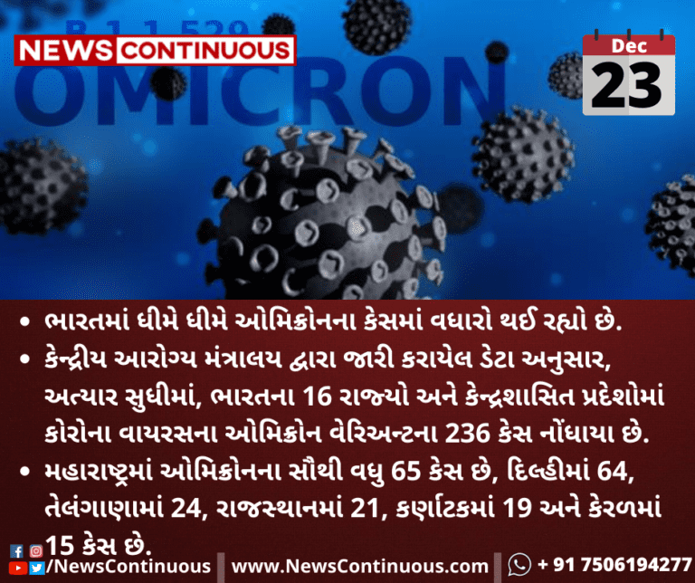 કેન્દ્રીય આરોગ્ય મંત્રાલય દ્વારા જારી કરાયેલ ડેટા અનુસાર, અત્યાર સુધીમાં, ભારતના 16 રાજ્યો અને કેન્દ્રશાસિત પ્રદેશોમાં કોરોના વાયરસના ઓમિક્રોન વેરિઅન્ટના 236 કેસ નોંધાયા છે.