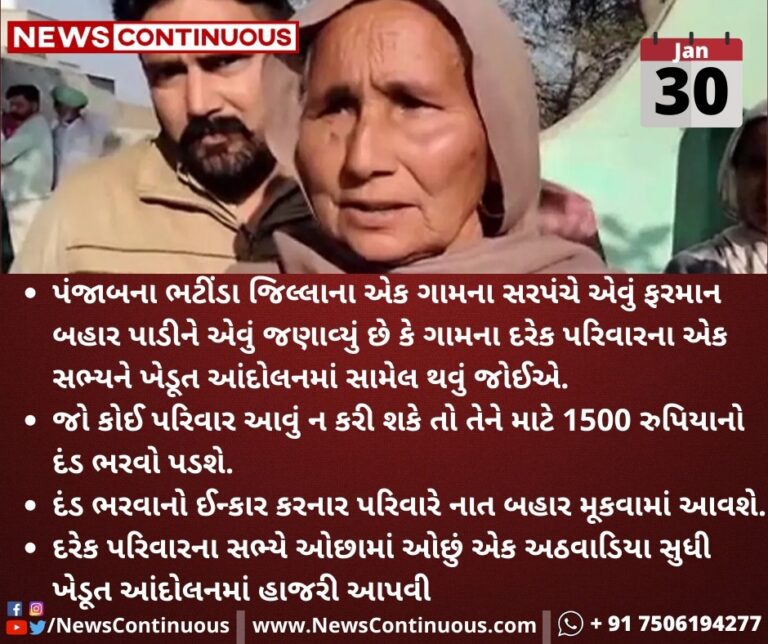 પંજાબના ભટીંડા જિલ્લાના એક ગામના સરપંચે એવું ફરમાન બહાર પાડીને એવું જણાવ્યું છે કે ગામના દરેક પરિવારના એક સભ્યને ખેડૂત આંદોલનમાં સામેલ થવું જોઈએ.