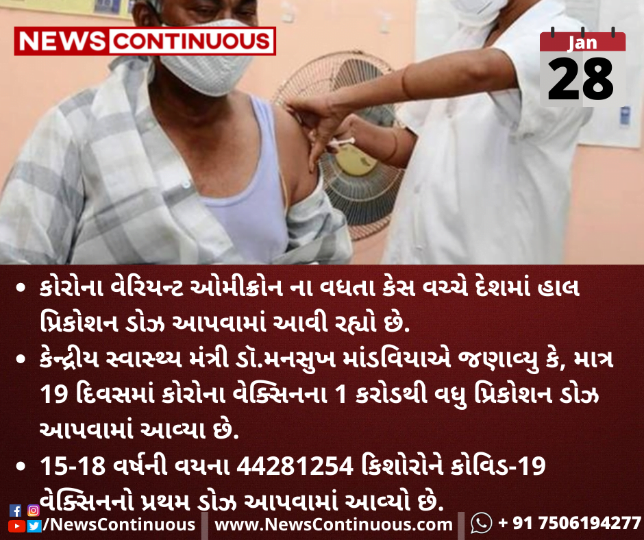 કેન્દ્રીય સ્વાસ્થ્ય મંત્રી ડૉ.મનસુખ માંડવિયાએ જણાવ્યુ કે, માત્ર 19 દિવસમાં કોરોના વેક્સિનના 1 કરોડથી વધુ પ્રિકોશન ડોઝ આપવામાં આવ્યા છે.