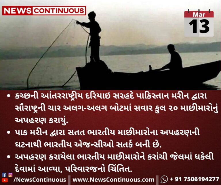 કચ્છની આંતરરાષ્ટ્રીય દરિયાઇ સરહદે પાકિસ્તાન મરીન દ્વારા સૌરાષ્ટ્રની ચાર અલગ-અલગ બોટમાં સવાર કુલ ૨૦ માછીમારોનું અપહરણ કરાયું.