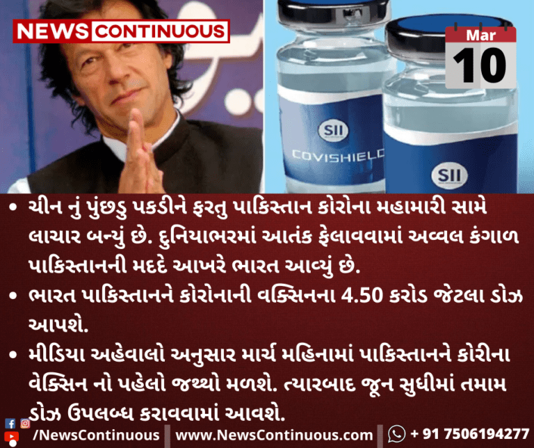 ભારત પાકિસ્તાનને કોરોનાની વક્સિનના 4.50 કરોડ જેટલા ડોઝ આપશે. મીડિયા અહેવાલો અનુસાર માર્ચ મહિનામાં પાકિસ્તાનને કોરીના વેક્સિન નો પહેલો જથ્થો મળશે. ત્યારબાદ જૂન સુધીમાં તમામ ડોઝ ઉપલબ્ધ કરાવવામાં આવશે.