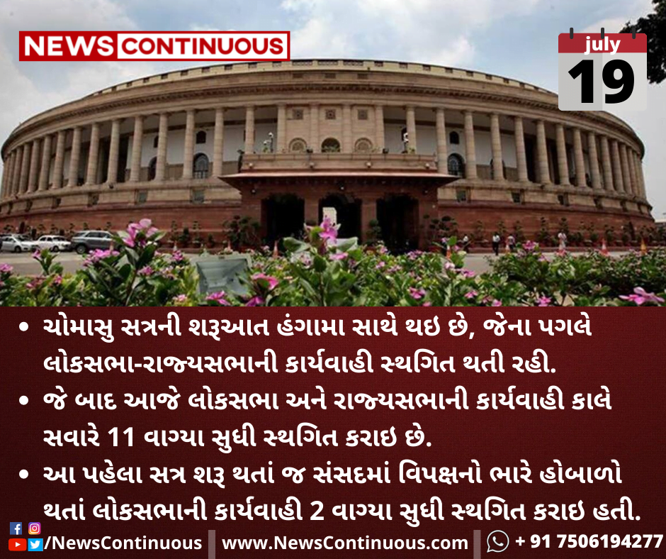 ચોમાસુ સત્રની શરૂઆત હંગામા સાથે થઇ છે, જેના પગલે લોકસભા-રાજ્યસભાની કાર્યવાહી સ્થગિત થતી રહી.
