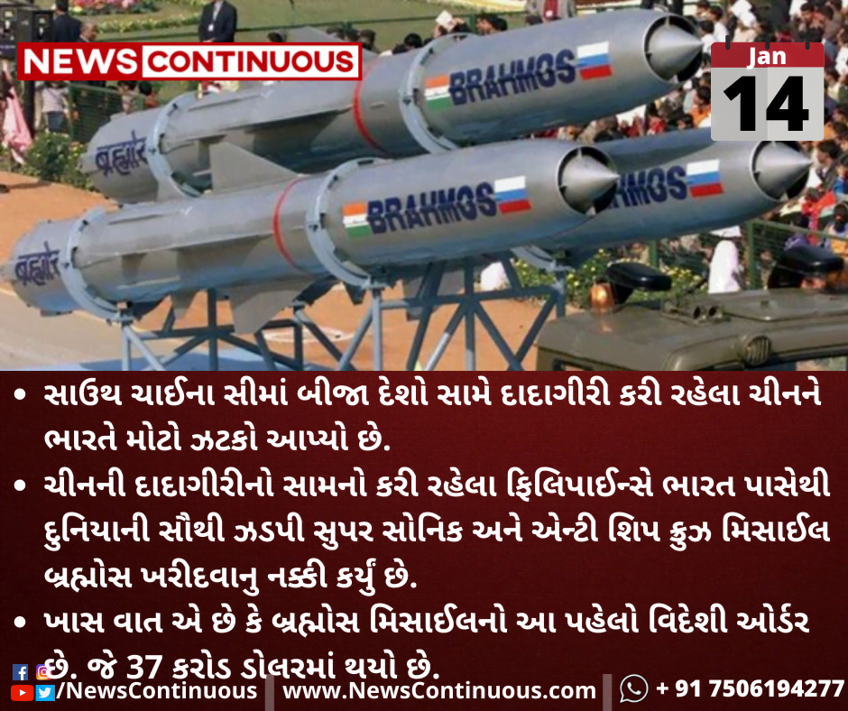 ચીનની દાદાગીરીનો સામનો કરી રહેલા ફિલિપાઈન્સે ભારત પાસે દુનિયાની સૌથી ઝડપી સુપર સોનિક અને એન્ટી શિપ ક્રુઝ મિસાઈલ બ્રહ્મોસ ખરીદવાનુ નક્કી કર્યું છે.