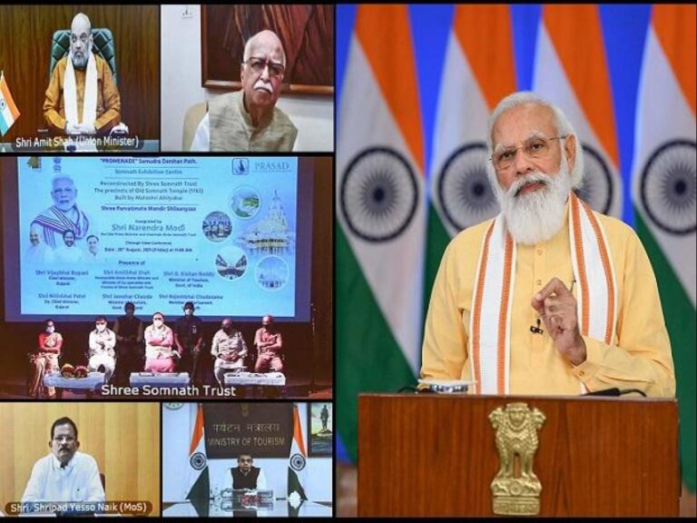 વડા પ્રધાન નરેન્દ્ર મોદીએ આજે વીડિયો કોન્ફરન્સિંગના માધ્યમથી ગુજરાતસ્થિત બાર જ્યોતિર્લિંગમાંથી પ્રથમ એવા સોમનાથમાં અનેક પ્રોજેક્ટ્સનું ઉદ્ઘાટન અને શિલાન્યાસ કર્યો છે. આ સિવાય તેમણે સોમનાથ પ્રદર્શન ગૅલેરી, જૂનું સોમનાથ મંદિર અને વૉક વેનું લોકાર્પણ અને પાર્વતી મંદિરનો શિલાન્યાસ કર્યો. આ કાર્યક્રમમાં કેન્દ્રીય ગૃહપ્રધાન અમિત શાહ, ભાજપના વરિષ્ઠ નેતા લાલ કૃષ્ણ અડવાણી અને મુખ્ય પ્રધાન વિજય રૂપાણી ઉપસ્થિત રહ્યા હતા.