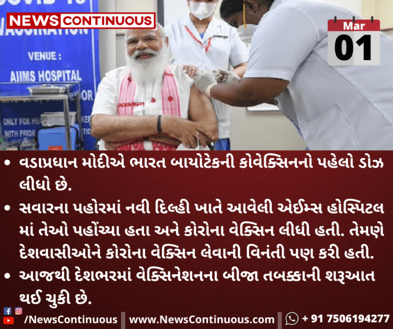 વડાપ્રધાન મોદીએ ભારત બાયોટેકની કોવેક્સિનનો પહેલો ડોઝ લીધો છે.