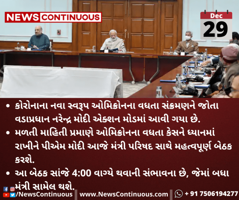 મળતી માહિતી પ્રમાણે ઓમિક્રોનના વધતા કેસને ધ્યાનમાં રાખીને પીએમ મોદી આજે મંત્રી પરિષદ સાથે મહત્વપૂર્ણ બેઠક કરશે.