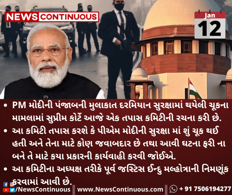 પીએમ મોદીની પંજાબની મુલાકાત દરમિયાન સુરક્ષામાં થયેલી ચૂકના મામલામાં તપાસ કરવા માટે સુપ્રીમ કોર્ટે આજે એક કમિટી બનાવી છે.