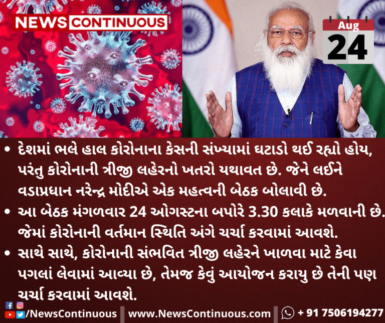 આ બેઠક મંગળવાર 24 ઓગસ્ટના બપોરે 3.30 કલાકે મળવાની છે. જેમાં કોરોનાની વર્તમાન સ્થિતિ અંગે ચર્ચા કરવામાં આવશે.