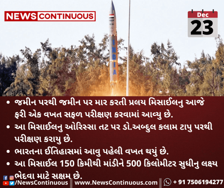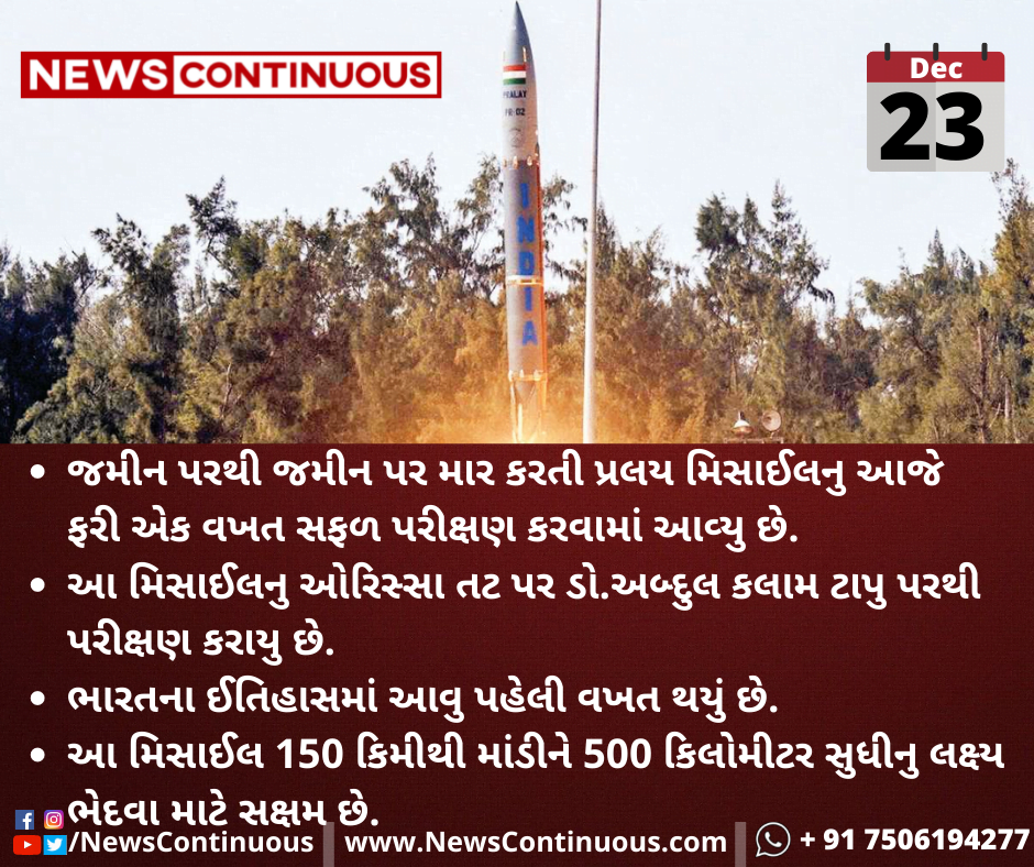 જમીન પરથી જમીન પર માર કરતી પ્રલય મિસાઈલનુ આજે ફરી એક વખત સફળ પરીક્ષણ કરવામાં આવ્યુ છે.