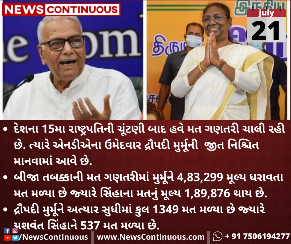 બીજા તબક્કાની મત ગણતરીમાં(vote counting) મુર્મૂને 4,83,299 મૂલ્ય ધરાવતા મત મળ્યા છે જ્યારે સિંહાના(yashwant Sinha) મતનું મૂલ્ય 1,89,876 થાય છે.