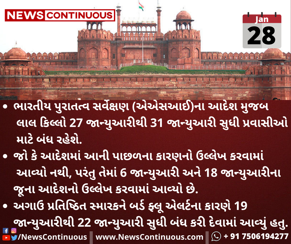 ભારતીય પુરાતત્વ સર્વેક્ષણ (એએસઆઈ)ના આદેશ મુજબ લાલ કિલ્લો 27 જાન્યુઆરીથી 31 જાન્યુઆરી સુધી પ્રવાસીઓ માટે બંધ રહેશે.