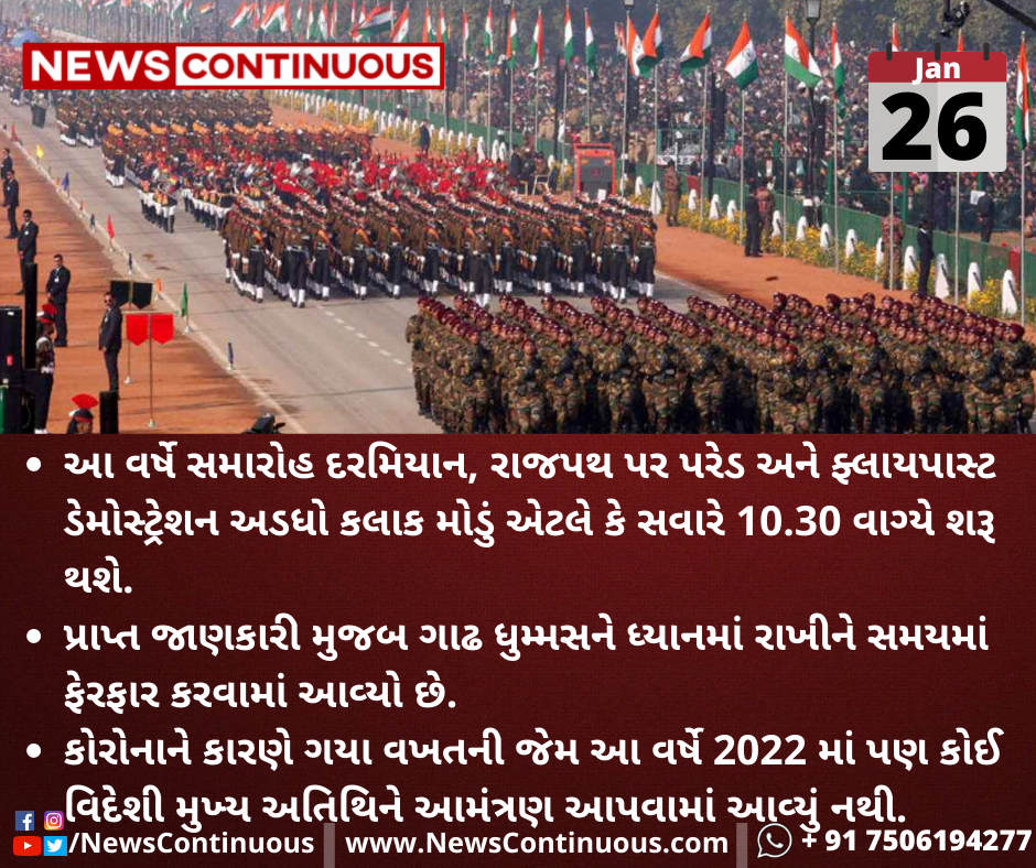 આ વર્ષે સમારોહ દરમિયાન, રાજપથ પર પરેડ અને ફ્લાયપાસ્ટ ડેમોસ્ટ્રેશન અડધો કલાક મોડું એટલે કે સવારે 10.30 વાગ્યે શરૂ થશે.