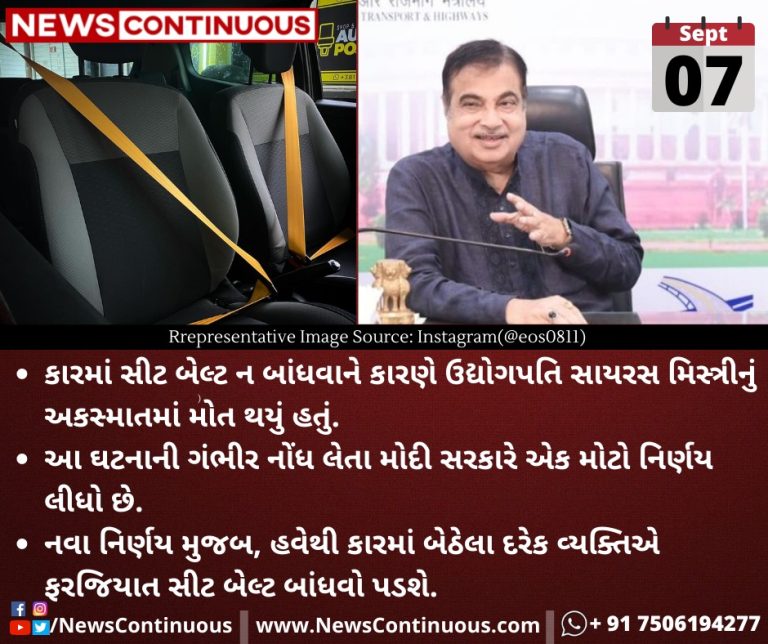 નવા નિર્ણય મુજબ, હવેથી કારમાં બેઠેલા દરેક વ્યક્તિએ ફરજિયાત સીટ બેલ્ટ (Mandatory seat belts) બાંધવો પડશે.