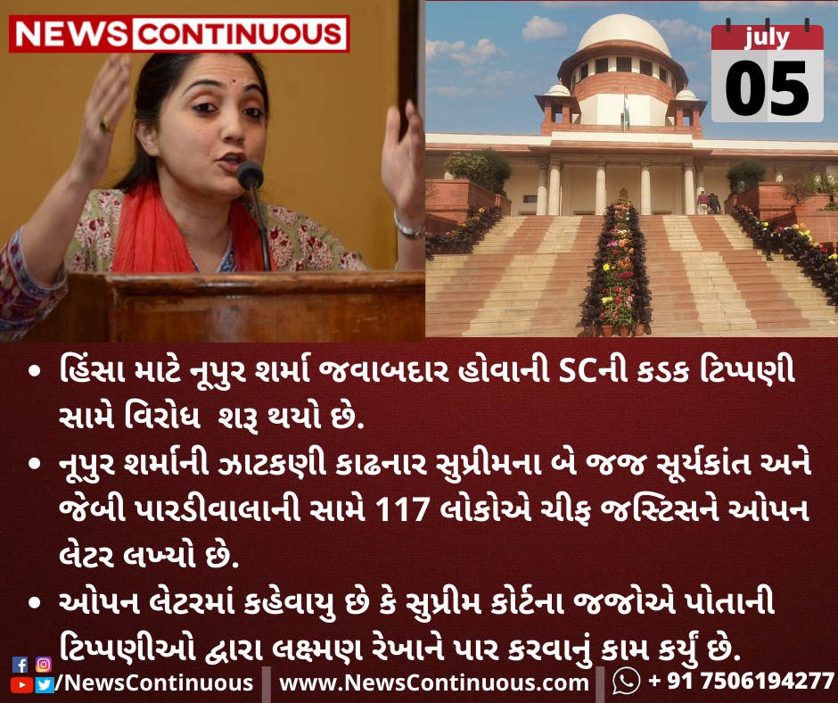 નૂપુર શર્માની ઝાટકણી કાઢનાર સુપ્રીમના(Supreme Court) બે જજ સૂર્યકાંત(Justice Suryakant) અને જેબી પારડીવાલાની(JB Pardiwala) સામે 117 લોકોએ ચીફ જસ્ટિસને(Chief Justice) ઓપન લેટર(Open letter) લખ્યો છે.