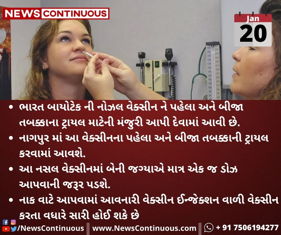 - ભારત બાયોટેક ની નોઝલ વેક્સીન ને પહેલા અને બીજા તબક્કાના ટ્રાયલ માટેની મંજુરી આપી દેવામાં આવી છે.