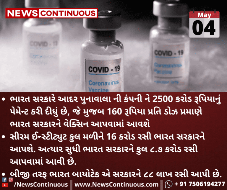 ભારત સરકારે આદર પુનાવાલા ની કંપની ને 2500 કરોડ રૂપિયાનું પેમેન્ટ કરી દીધું છે, જે મુજબ 160 રૂપિયા પ્રતિ ડોઝ પ્રમાણે ભારત સરકારને વેક્સિન આપવામાં આવશે