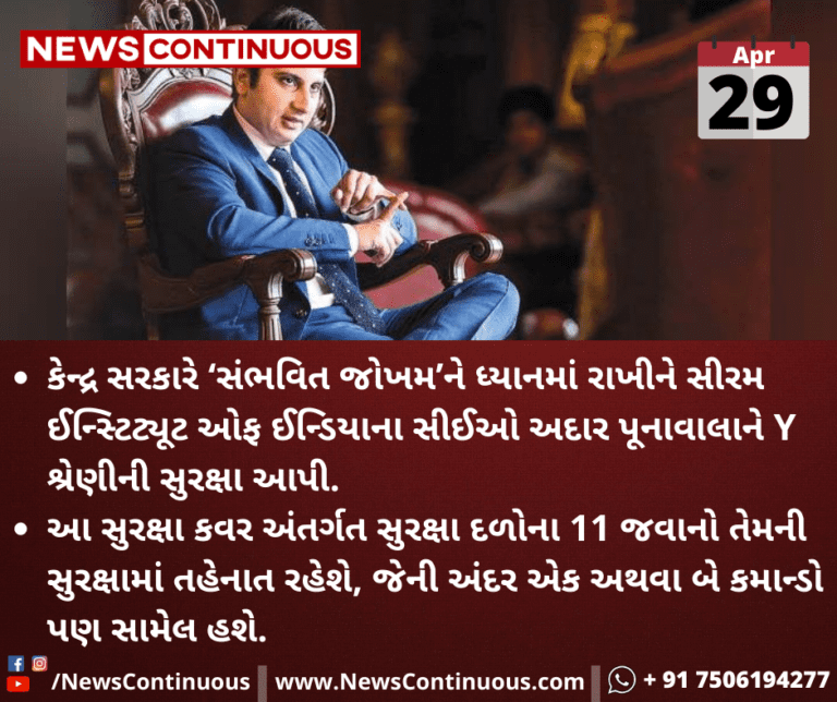 કેન્દ્ર સરકારે ‘સંભવિત જોખમ’ને ધ્યાનમાં રાખીને સીરમ ઈન્સ્ટિટ્યૂટ ઓફ ઈન્ડિયા (SII)ના સીઈઓ અદાર પૂનાવાલાને Y શ્રેણીની સુરક્ષા આપી છે.