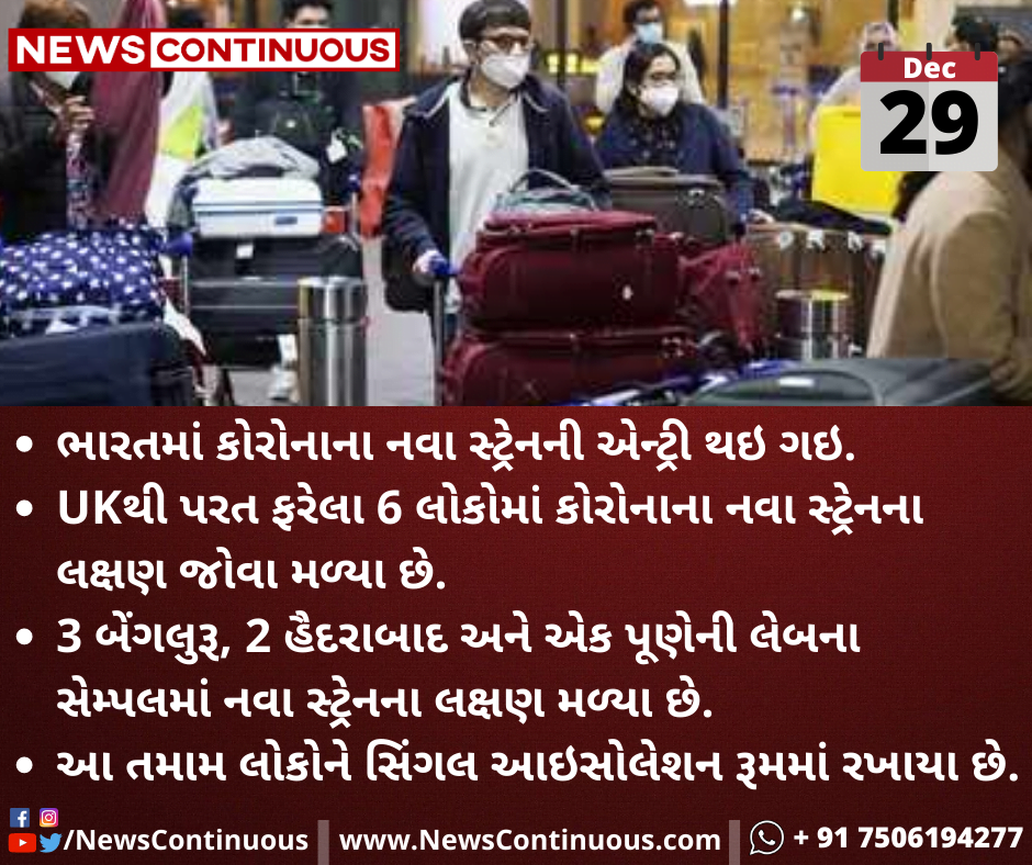 - UKથી પરત ફરેલા 6 લોકોમાં કોરોનાના નવા સ્ટ્રેનના લક્ષણ જોવા મળ્યા છે.