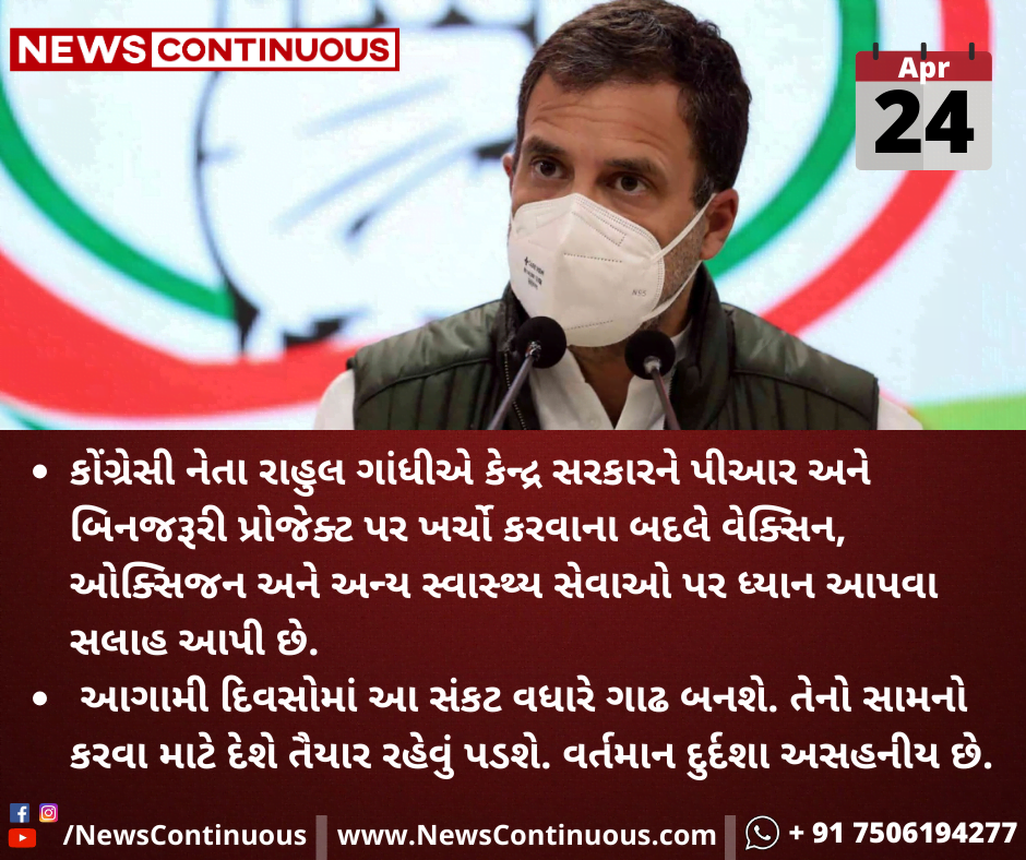 કોંગ્રેસી નેતા રાહુલ ગાંધીએ કેન્દ્ર સરકારને પીઆર અને બિનજરૂરી પ્રોજેક્ટ પર ખર્ચો કરવાના બદલે વેક્સિન, ઓક્સિજન અને અન્ય સ્વાસ્થ્ય સેવાઓ પર ધ્યાન આપવા સલાહ આપી છે.