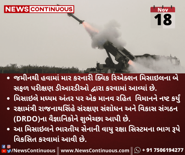 જમીનથી હવામાં માર કરનારી ક્વિક રિએક્શન મિસાઇલનું સફળ પરીક્ષણ. કેવી છે મિસાઈલ, જાણો અહીં.