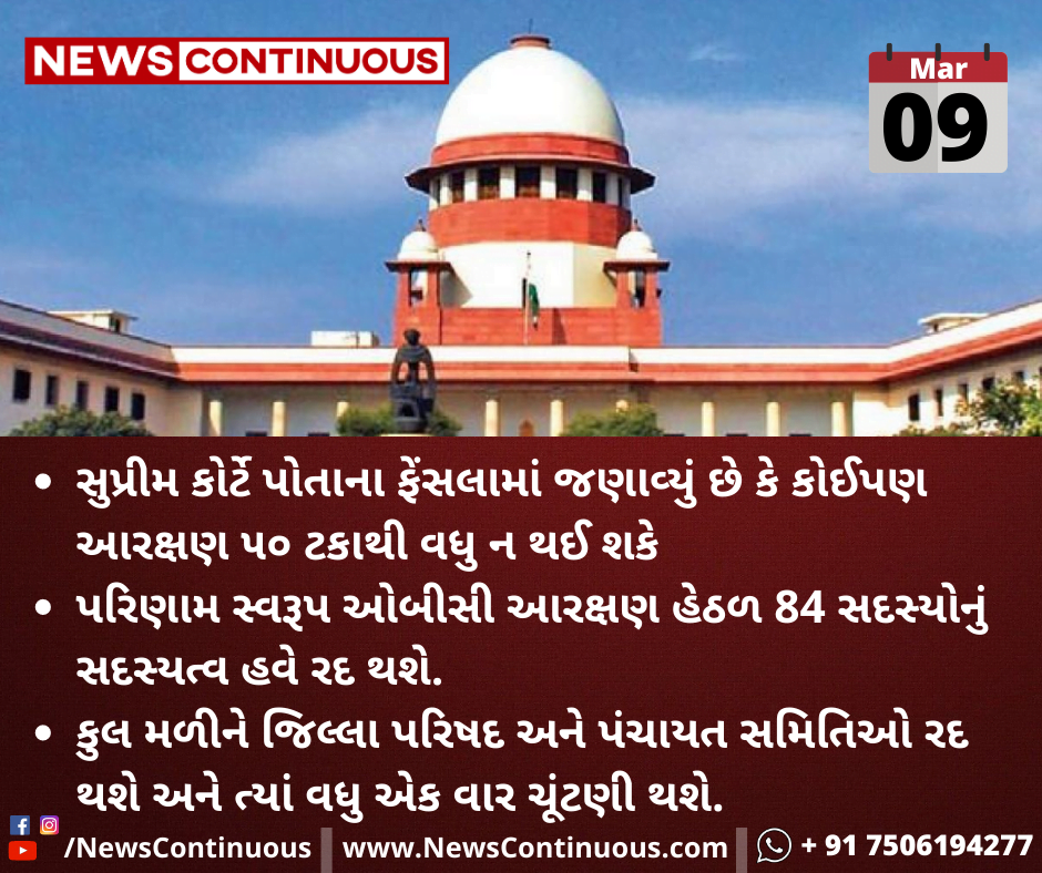 પરિણામ સ્વરૂપ ઓબીસી આરક્ષણ હેઠળ 84 સદસ્યોનું સદસ્યત્વ હવે રદ થશે.