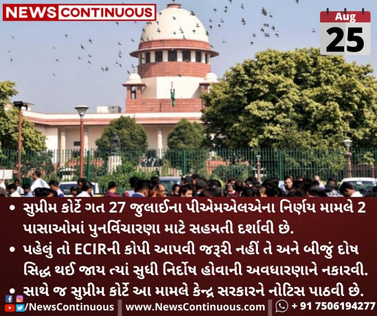 સુપ્રીમ કોર્ટે(Supreme Court) ગત 27 જુલાઈના પીએમએલએના(PMLA) નિર્ણય મામલે 2 પાસાઓમાં પુનર્વિચારણા(Aspects Reconsidered) માટે સહમતી દર્શાવી છે.
