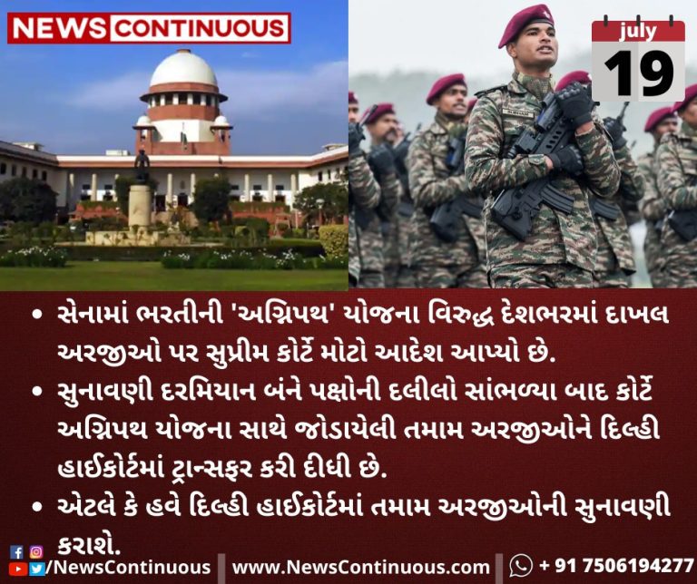 સેનામાં ભરતીની(Army recruitment) 'અગ્નિપથ' યોજના(Agnipath Scheme) વિરુદ્ધ દેશભરમાં દાખલ અરજીઓ(Submitted applications) પર સુપ્રીમ કોર્ટે(Supreme Court) મોટો આદેશ આપ્યો છે.