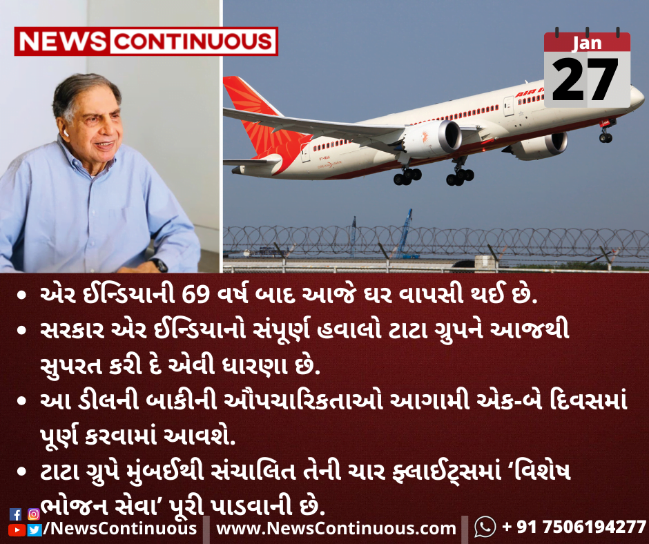 સરકાર એર ઈન્ડિયાનો સંપૂર્ણ હવાલો ટાટા ગ્રુપને આજથી સુપરત કરી દે એવી ધારણા છે.