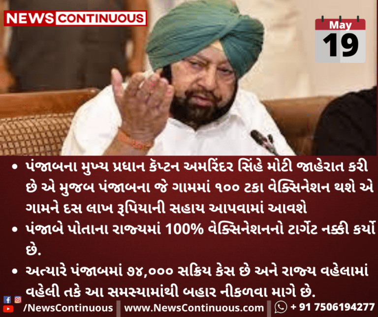 પંજાબના મુખ્ય પ્રધાન કૅપ્ટન અમરિંદર સિંહે મોટી જાહેરાત કરી છે એ મુજબ પંજાબના જે ગામમાં ૧૦૦ ટકા વેક્સિનેશન થશે એ ગામને દસ લાખ રૂપિયાની સહાય આપવામાં આવશે.