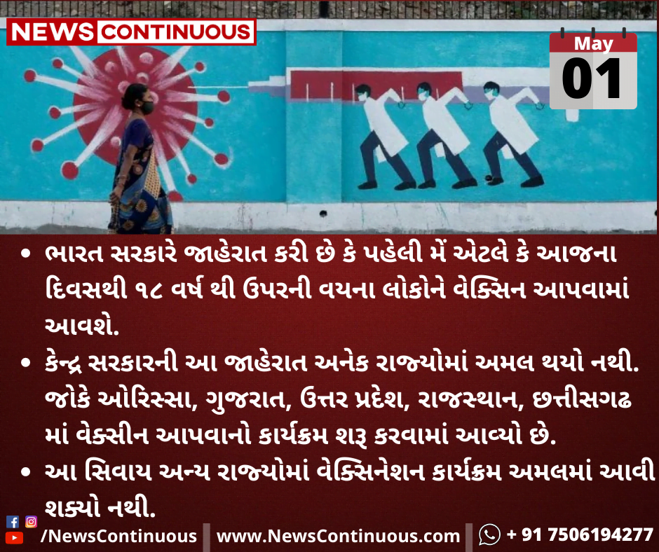 ભારત સરકારે જાહેરાત કરી છે કે પહેલી મેં એટલે કે આજના દિવસથી ૧૮ ઉપરની વયના લોકોને વેક્સિન આપવામાં આવશે.