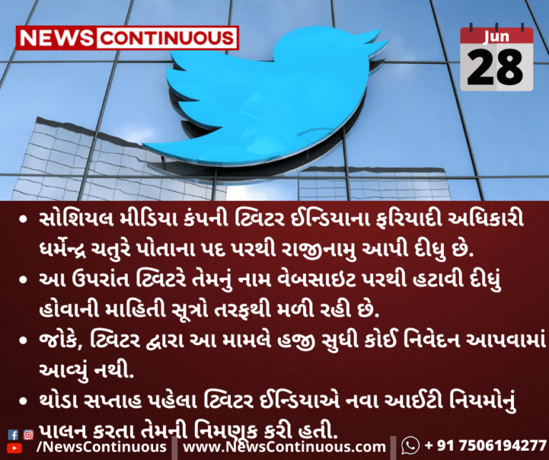 સોશિયલ મીડિયા કંપની ટ્વિટર ઈન્ડિયાના ફરિયાદી અધિકારી ધર્મેન્દ્ર ચતુરે પોતાના પદ પરથી રાજીનામુ આપી દીધુ છે.