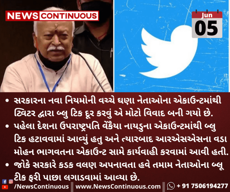 પહેલા દેશના ઉપરાષ્ટ્રપતિ વેંકૈયા નાયડુના એકાઉન્ટમાંથી બ્લુ ટિક હટાવવામાં આવ્યું હતુ અને ત્યારબાદ આરએસએસના વડા મોહન ભાગવત સહિત ઘણા નેતાઓના એકાઉન્ટ સામે કાર્યવાહી કરવામાં આવી હતી.