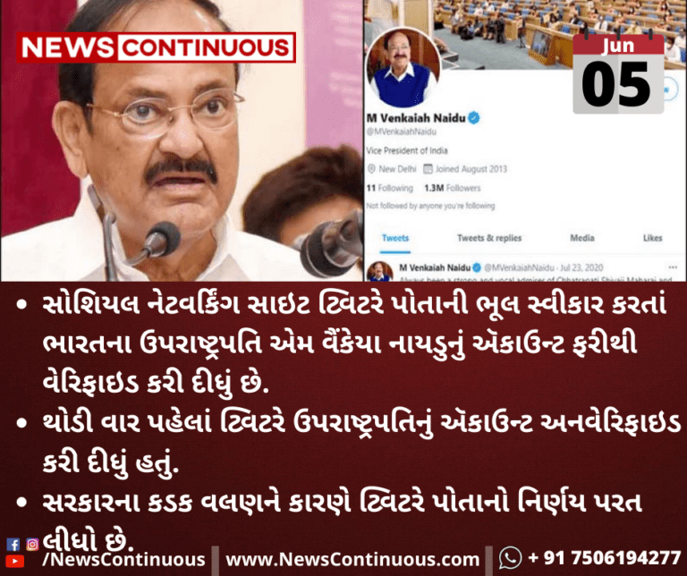 સોશિયલ નેટવર્કિંગ સાઇટ ટ્વિટરે પોતાની ભૂલ સ્વીકાર કરતાં ભારતના ઉપરાષ્ટ્રપતિ એમ વૈંકેયા નાયડુનું ઍકાઉન્ટ ફરીથી વેરિફાઇડ કરી દીધું છે.