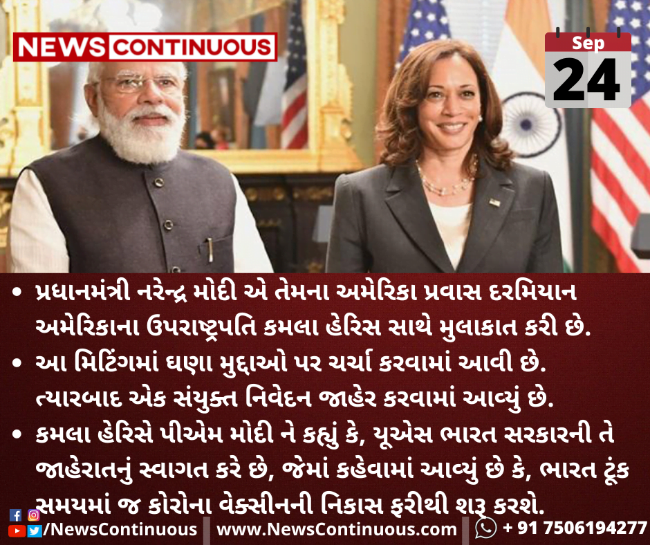 પ્રધાનમંત્રી નરેન્દ્ર મોદી એ તેમના અમેરિકા પ્રવાસ દરમિયાન અમેરિકાના ઉપરાષ્ટ્રપતિ કમલા હેરિસ સાથે મુલાકાત કરી છે.