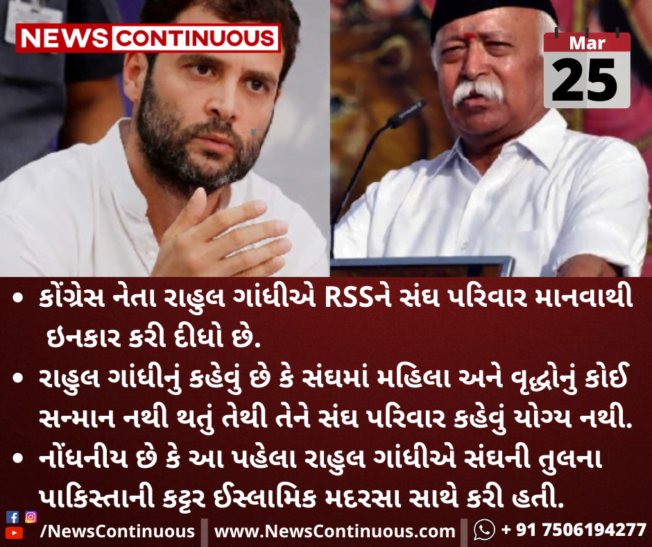 કોંગ્રેસ નેતા રાહુલ ગાંધીએ RSSને સંઘ પરિવાર માનવાથી જ ઇનકાર કરી દીધો છે.