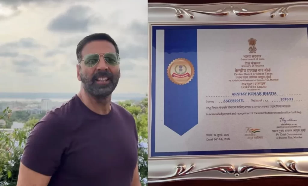 અક્ષય કુમાર બોલિવૂડના સૌથી વ્યસ્ત (Akshay Kumar)કલાકારોમાંથી એક છે. અક્ષય કુમારની એક વર્ષમાં ચાર-પાંચ ફિલ્મો રિલીઝ થાય છે. અક્ષય કુમાર વિશે ઘણી વખત એવા સમાચાર આવે છે કે તે બોલિવૂડમાં એક માત્ર એવો અભિનેતા છે જે સૌથી વધુ ટેક્સ ચૂકવે(taxpayer) છે. હવે આ સંદર્ભમાં સૌથી વધુ ટેક્સ ચૂકવવા બદલ આવકવેરા વિભાગ(Income tax department) દ્વારા અભિનેતાનું સન્માન કરવામાં આવ્યું છે.