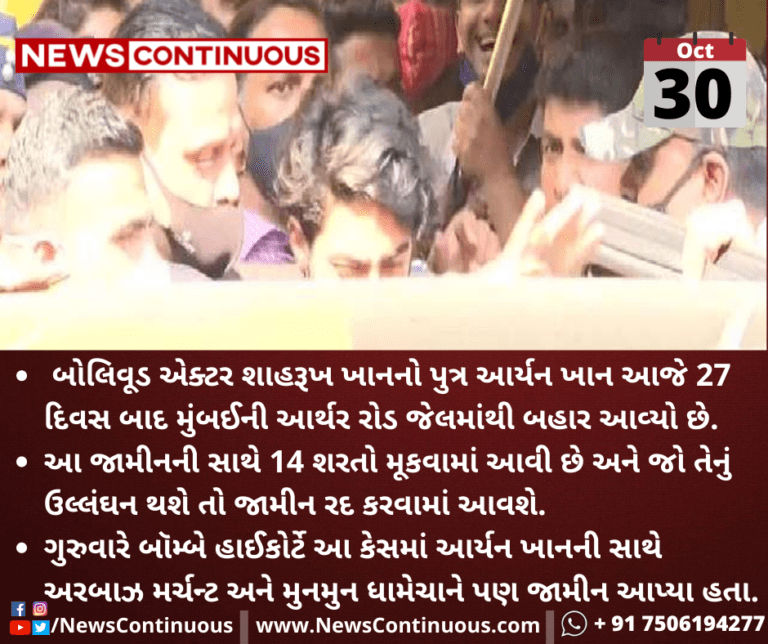 બોલિવૂડ એક્ટર શાહરૂખ ખાનનો પુત્ર આર્યન ખાન આજે 27 દિવસ બાદ મુંબઈની આર્થર રોડ જેલમાંથી બહાર આવ્યો છે.