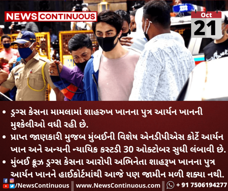 પ્રાપ્ત જાણકારી મુજબ મુંબઈની વિશેષ એનડીપીએસ કોર્ટે આર્યન ખાન અને અન્યની ન્યાયિક કસ્ટડી 30 ઓક્ટોબર સુધી લંબાવી છે.