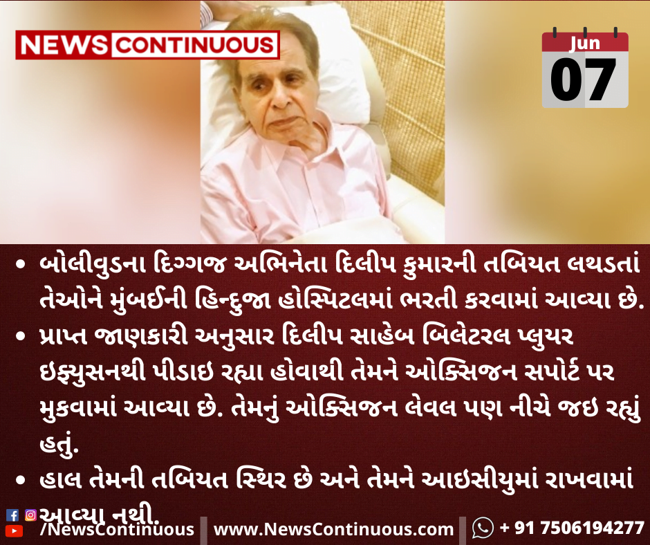 ઉલ્લેખનીય છે કે દિલીપ સાહબને રૂટિન ચેકઅપ માટે નોન કોવિડ પીડી હિંદુજામાં દાખલ કરવામાં આવ્યા હતા, તેમને ગત થોડા દિવસોથી શ્વાસ લેવામાં તકલીફ હતી.